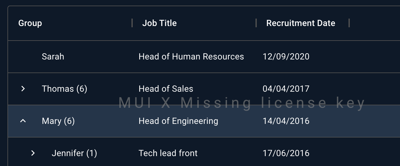 MUI X Premium unlocks the most advanced features of the Data Grid, including row grouping and Excel exporting, as well as everything offered in the Pro plan.